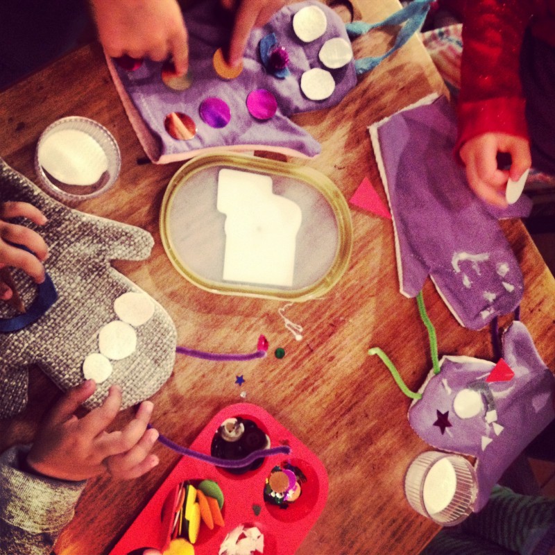 All the children were given a puppet to decorate, so they could each make their own troll. Leigh had hand-sewn the lot. She provided PVA, teeth she had cut out, eyes, buttons, sequins, ribbons and more so they could go monster mad. I was very impressed she’d gone to all this effort! Especially as she has a six-month-old baby (who had her up five times last night. Leigh, you’re a rockstar). AND she’s doing ArtWave this year…