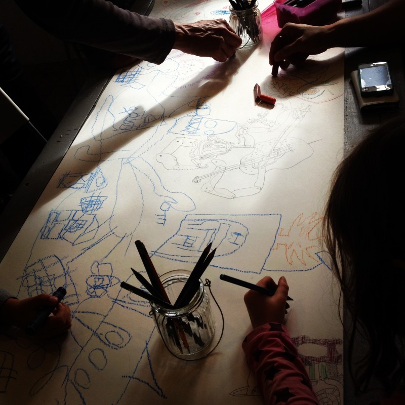 Anyone who read my last post will know that Little Lewes was asked to partner Chris’s event ‘Oodles of Doodles‘. It was a dream for my littlest one particularly. A roll of paper laid out over a long table, with pots of graphite, crayons, waxy pastels and pencils laid out along it.