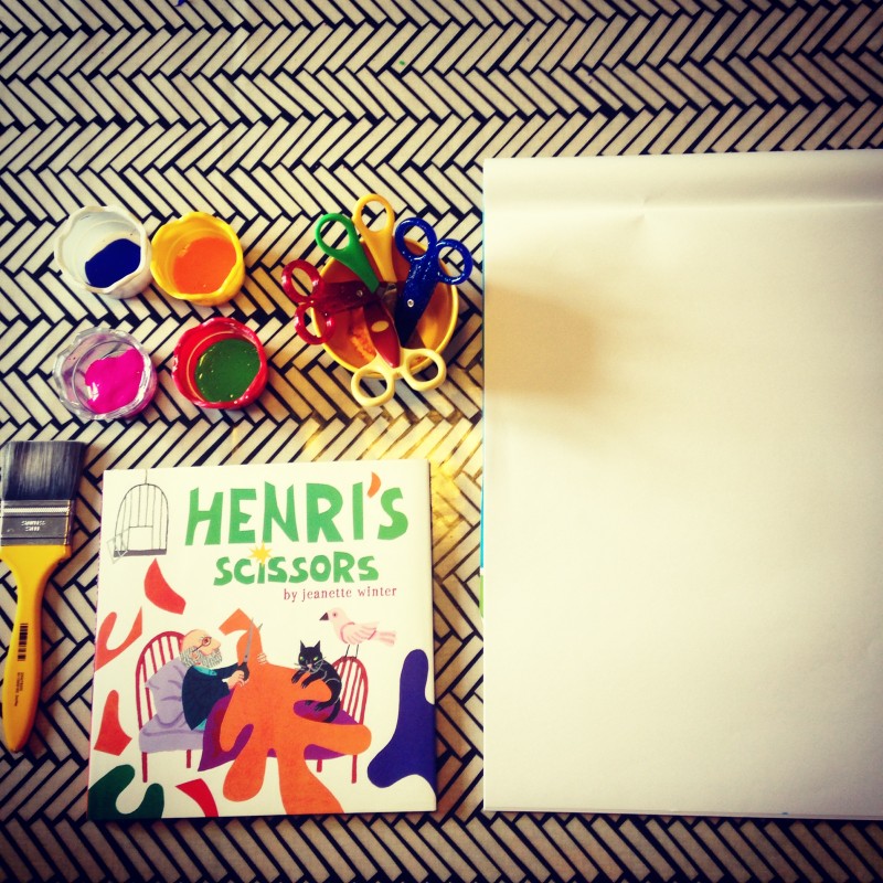 The book is called ‘Henri’s Scissors‘ and is by Jeanette Winters. It tells of Matisse’s life, how he was always drawing and came to give up law in order to paint. And then how he fell ill as an elderly man and could no longer make his art. He moved to a seaside spot and the clear air revived him. One day he picked up some scissors and cut shapes from pieces of coloured paper, which he stuck to other pieces of coloured paper to create his work.