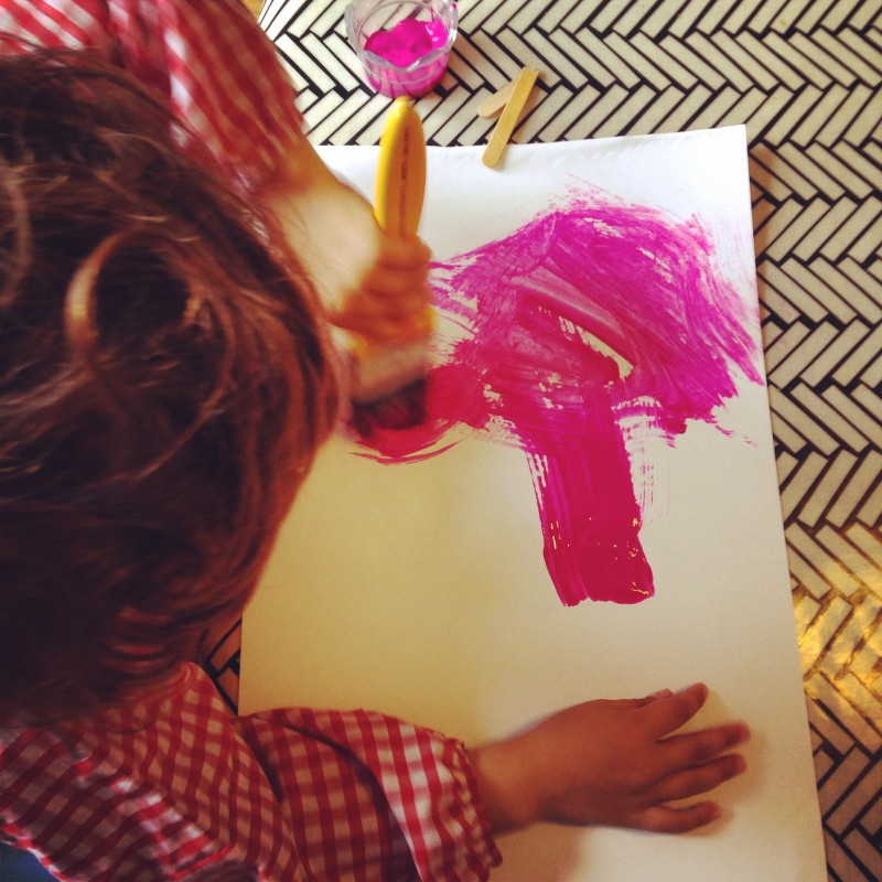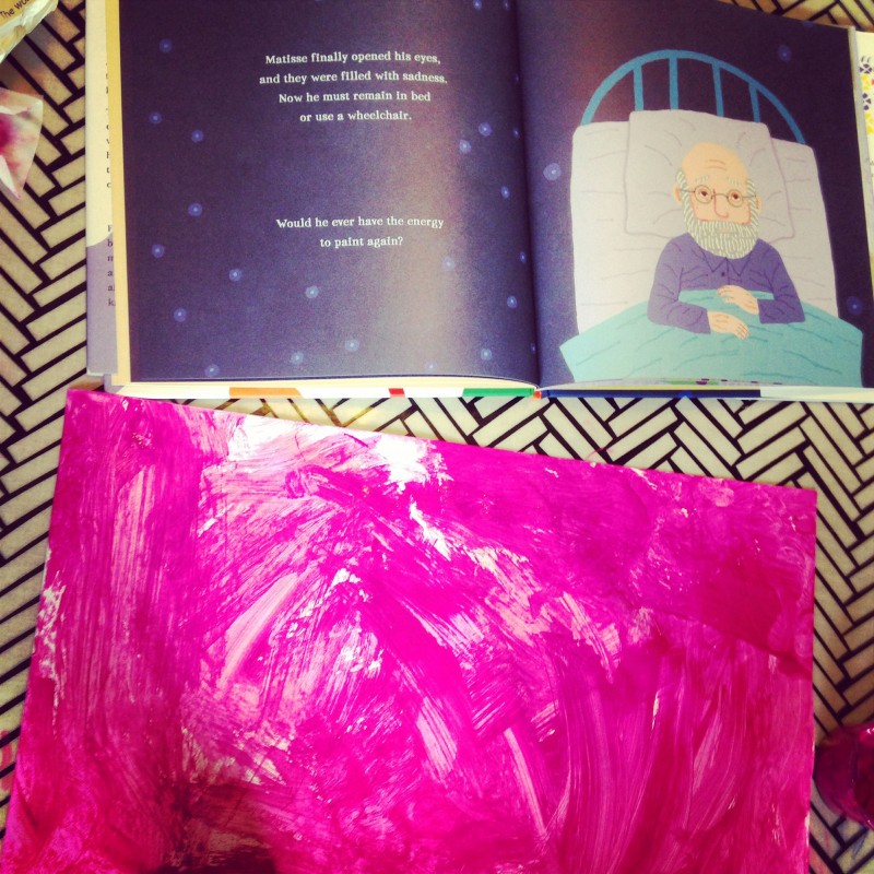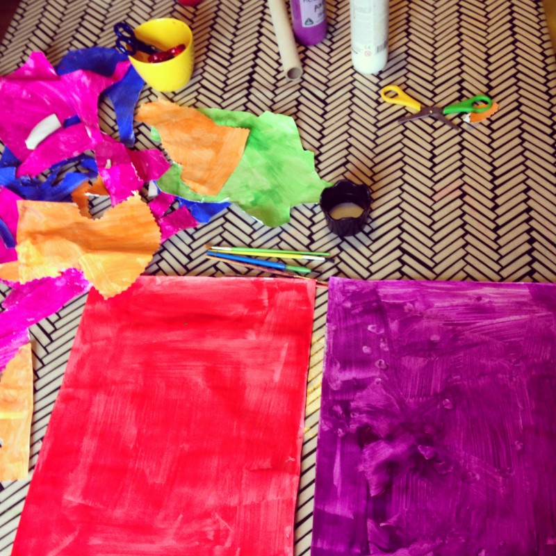 We created this activity by first painting sheets of paper. He chose the pink, blue, orange and green because these are the colours on the front of the book. We let them dry in the sun and then he painted two more sheets (“like Henri’s assistants did”) in red and purple.