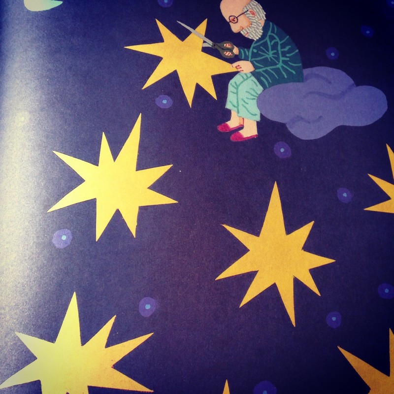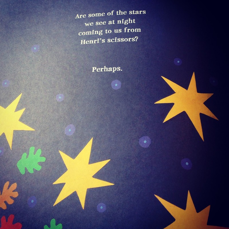 At the end the book, Henri gets up out of bed and walks into his ‘garden’, then he keeps on going up and up into the sky. The book ends asking: ‘Are some of the stars we see at night coming to us from Henri’s scissors?’
