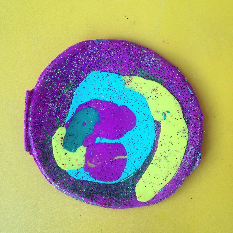 1) Roll out all the colours super-thin. Don’t worry about a circular cookie cutter, we just used the mouth of a glass.