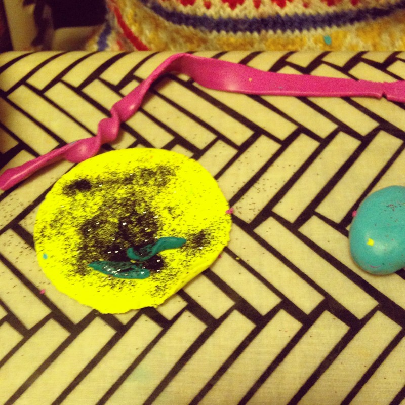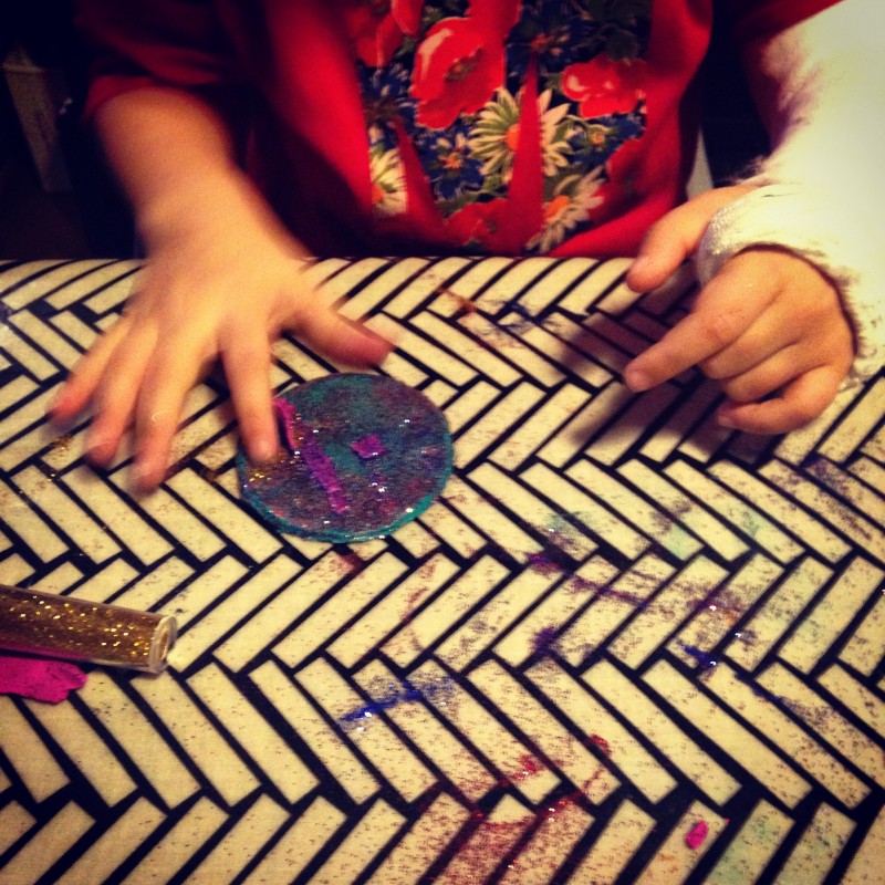 Again, like all the craft on this blog, I take absolutely no credit for this idea. It belongs to Joy Cho, an American super-blogger and designer at Oh Joy!. Her very professional pictures look much better than mine as the Los Angeles sun was blazing outside, whereas I was taking mine on a dark English December evening on an iPhone with no flash. Plus she did not frame this as a kids activity and as you can see, ours do not follow much rhyme or reason. Still, I think they’re pretty cute.
