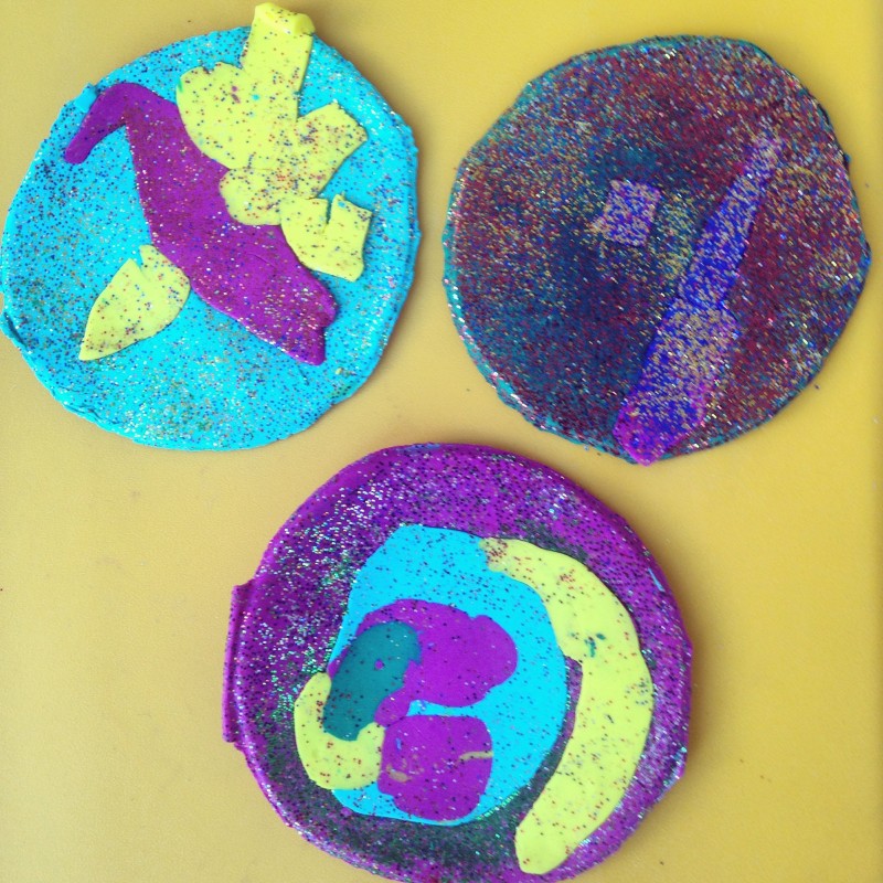 This year we’re doing the coasters, which require a few blocks of Fimo (£2.50 each from Clarkes down in Cliffe) and some glitter (a pack of tubes from Clarkes upstairs in the toy bit, or large tubs downstairs by the spray paint. I also found tubs of quite fat glitter sparkles at Fun Learning today and wish we’d had those for this).