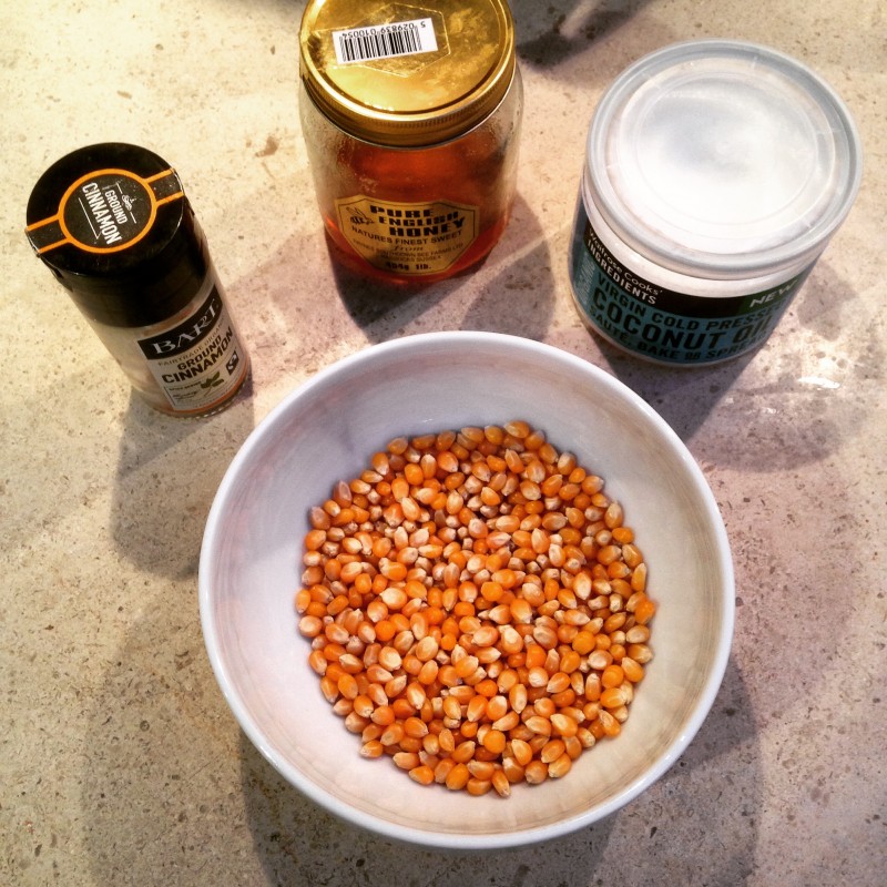 4) Quickly tip the warm popcorn into a bowl. Drizzle with the honey and cinnamon – you’ll have to do this by eye/to taste but no need to be too precious about it. Just do it little by little, and keep mixing and trying.