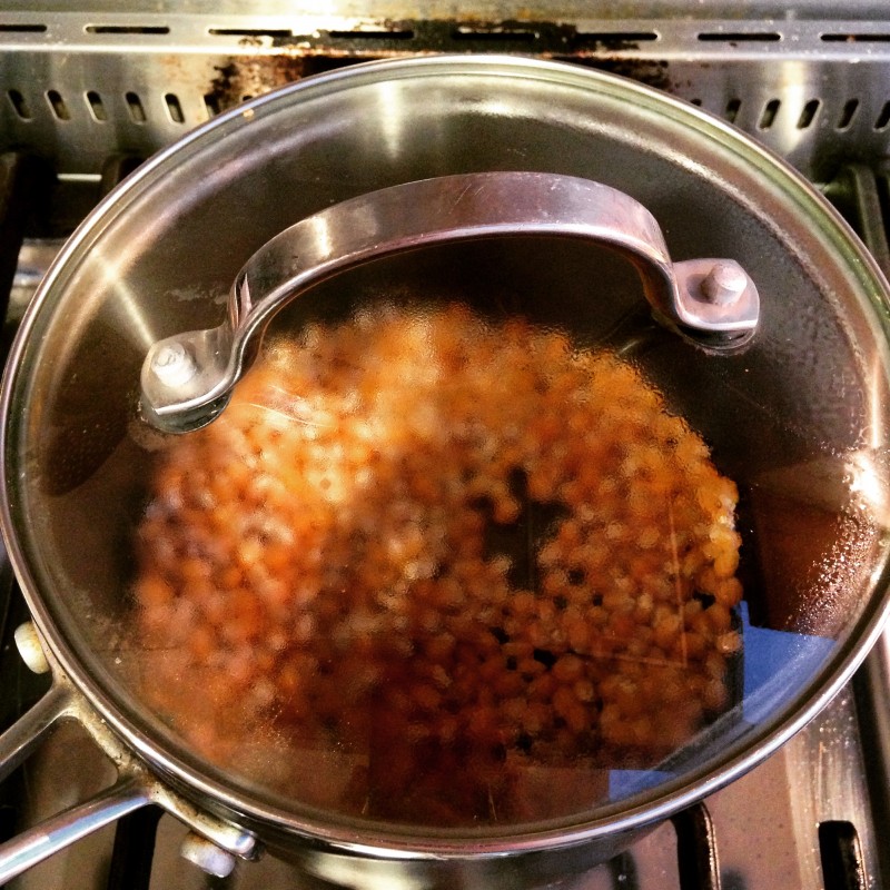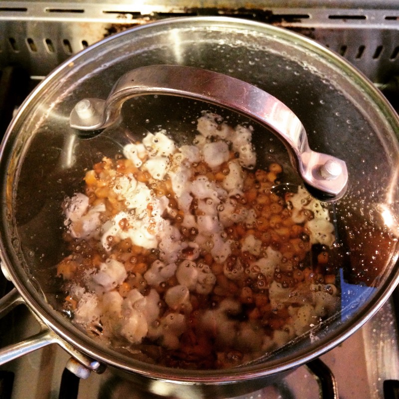 3) And pop and pop and pop. Shake it periodically and keep holding the lid on, as if the corn to pan-size ratio isn’t quite right, the popped corn will start to push against it. Once you can’t hear any more popping, remove from the heat (if you leave it on the popcorn will quickly blacken and burn).