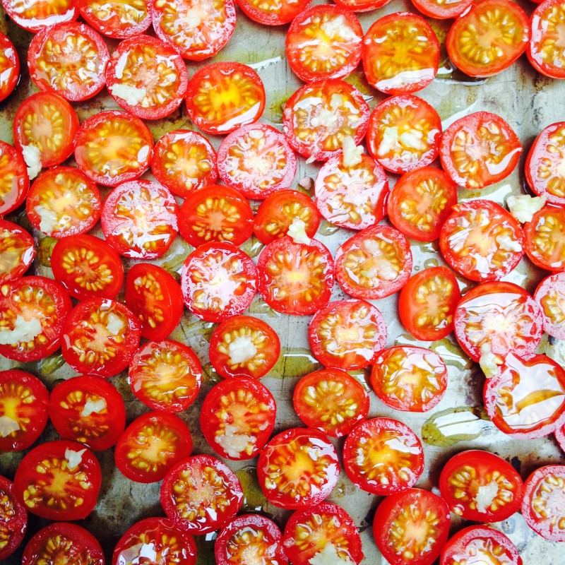 1) Pre-heat oven to 220 degrees C (200 if fan) and wash your cherry tomatoes. Cut them in half width-ways before nestling them snugly together cut side-up in a baking tray or ovenproof dish.