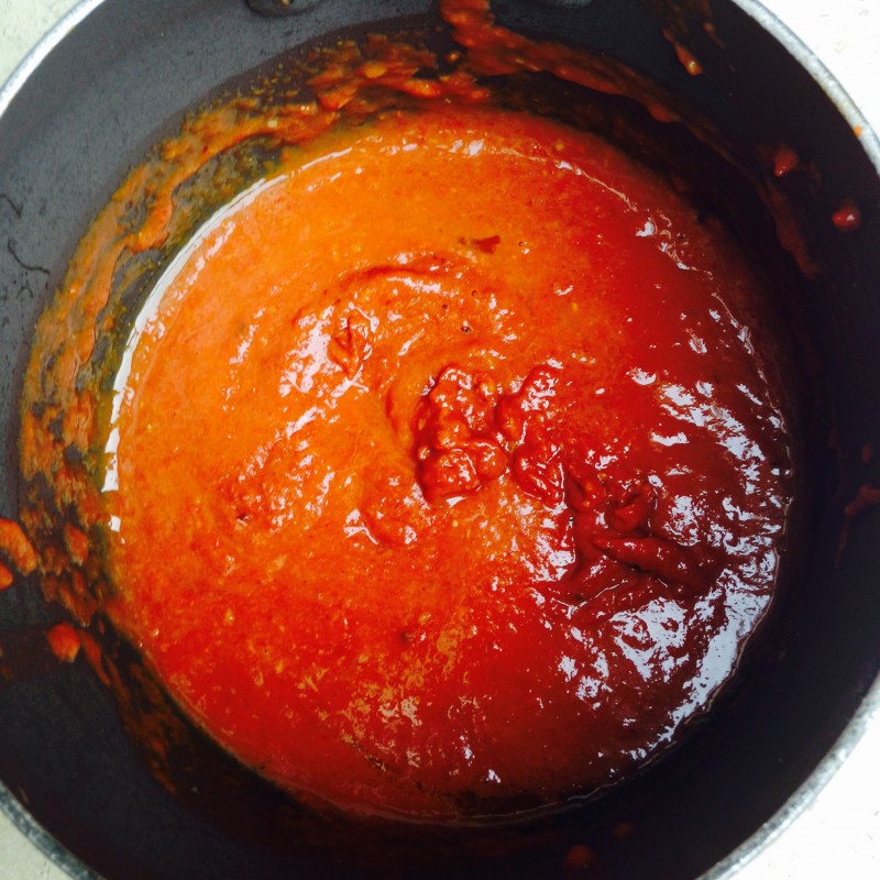 4) Put the tomatoes in a sieve over a pan or bowl. Push the tomatoes through the sieve with the most appropriate spoon you can find for the job. Put your back into it.