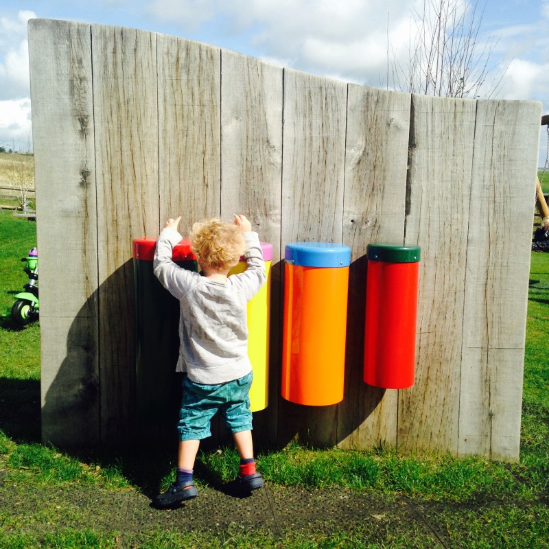 On to ‘bong-bong-bong’ on the giant musical instruments and a snaky flattened ‘maze’ (see top), and then through the gate to the second half of the playground, with another willow tunnel, huge swings, the acorn tower (which had Tellytubby-land-like grass tunnels around it) and a smooth wood climbing wall.